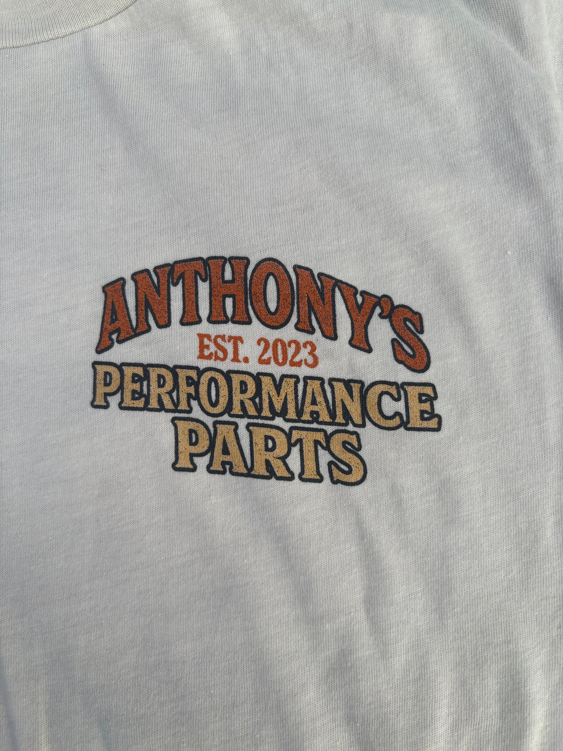 The first t-shirt design from Anthony's Performance Parts! Retro styling and a vintage feel to show your love of Chevrolet muscle cars, classics and all things Chevrolet with the classic Chevrolet small block engine on the back. Oatmeal colored shirt with vintage orange, brown and black colors to give you a classic drag strip or parts house t-shirt.